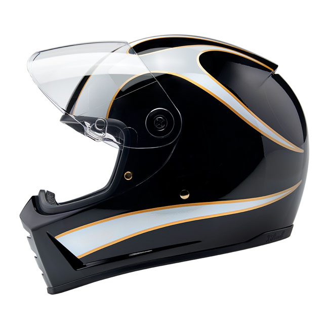 Progressivt designet og grundigt testet; Biltwell Lane Splitter; ECE 06- og DOT-godkendt; hjelmen er det bedste valg for motorcyklister, der kræver komfort og høj ydeevne. Hjelmen skiller sig virkelig ud på markedet for hjelme i retrostil med sine aggressive linjer. Funktionerne omfatter en robust ABS-yderskal med håndmalet finish, ventileret og stødabsorberende EPS-sikkerhedsforing med smuk håndsyet indvendig polstring, aftagelige kindpuder og klart CE-certificeret visir med antidug- og ridsebeskyttelse. Lane Splitter har også lydkommunikationslommer i ørefordybningerne, Double-D-hagebåndslåsemekanisme, hagebåndsventilation og venturi-ventilation for rigelig luftgennemstrømning.